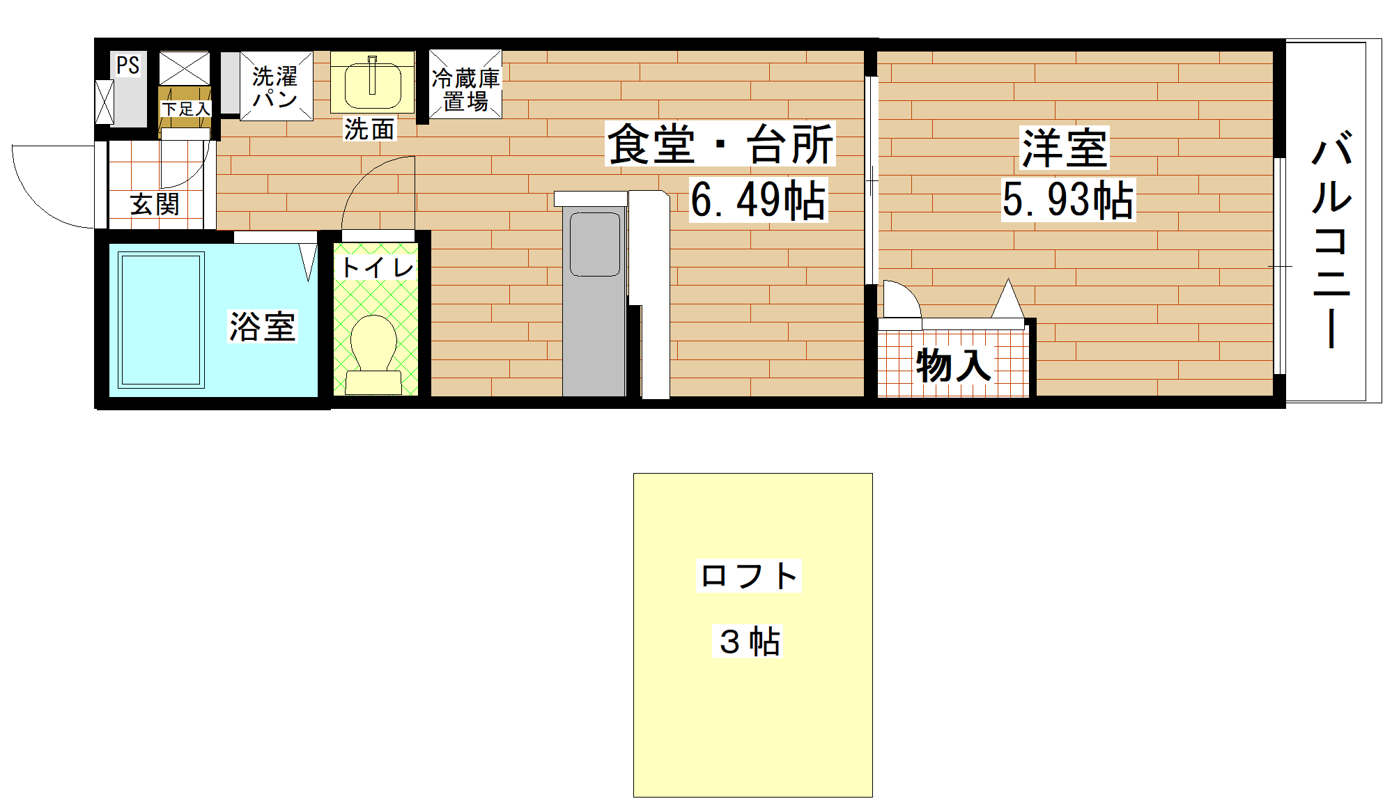 | 賃 料 | 56.000円 | 共益費 | 3.000円 | 保証金 | なし | 間取り | 洋室5.93帖+ロフト・台所食堂6.49帖 | 総庫数 | 16戸 |