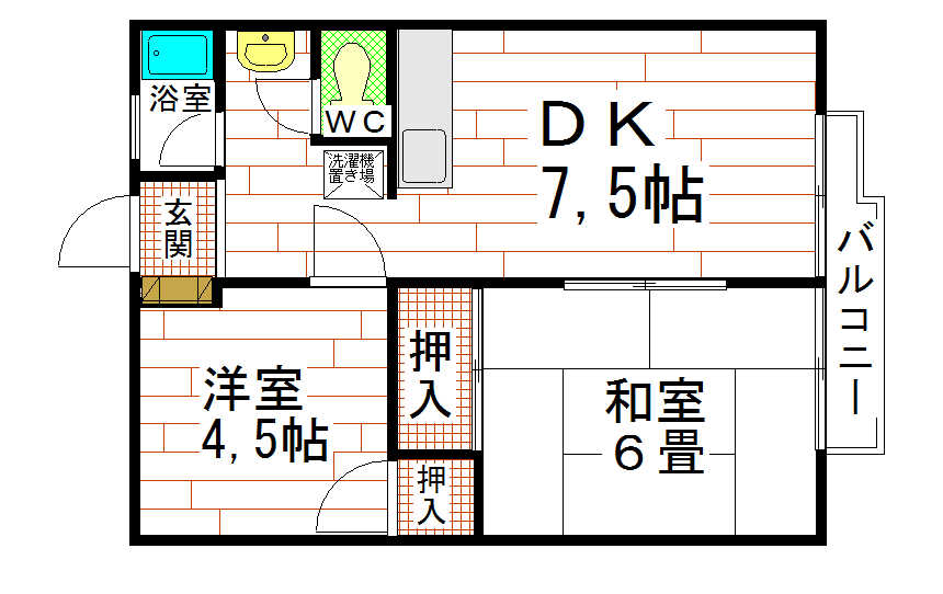 | 賃 料 | 5.2万円 | 共益費 | なし | 保証金 | なし | 間取り | 和室6帖・洋室4.5帖+DK7.5帖 | 総庫数 | 12 |